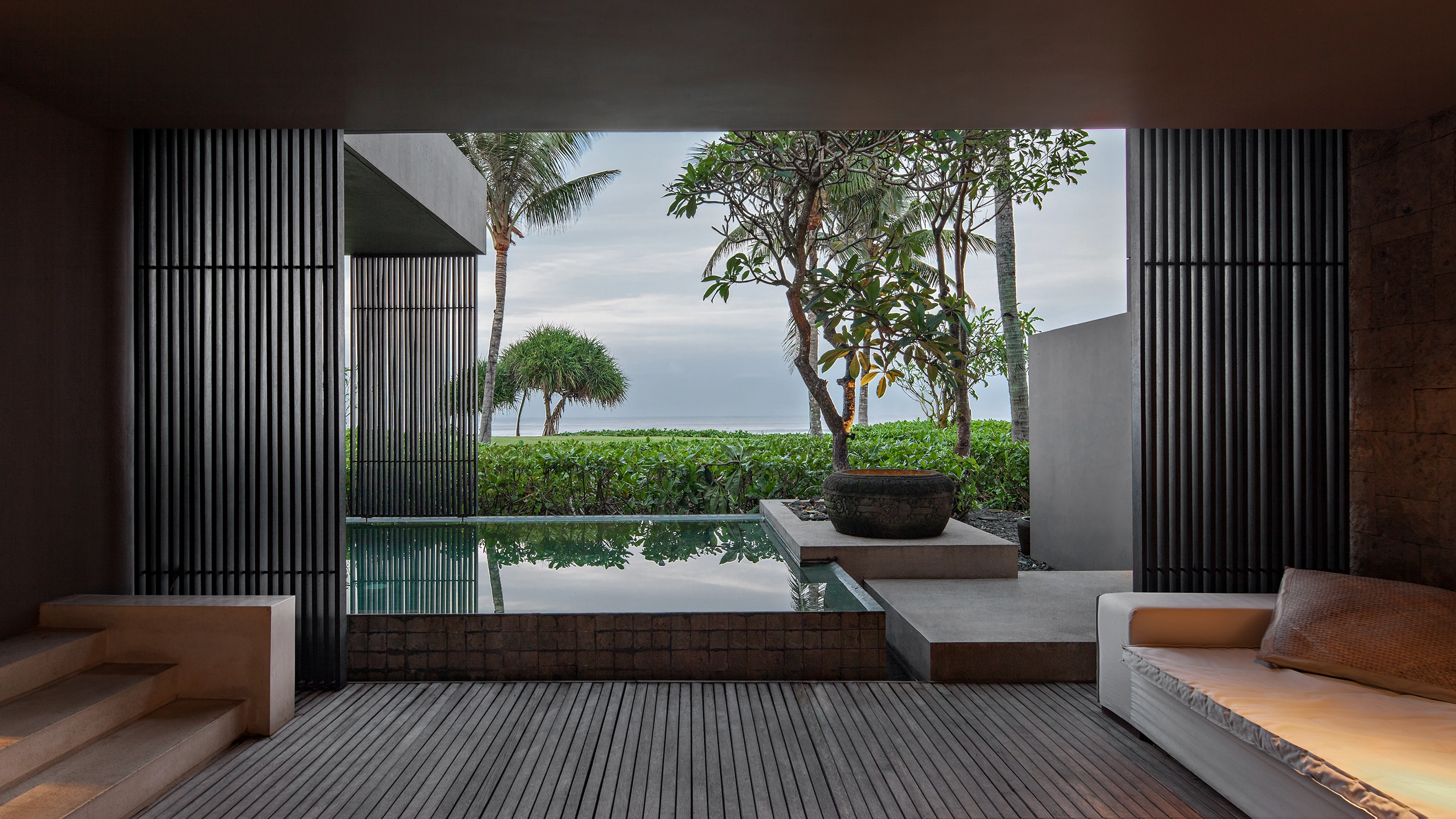 Designed, owned and operated by renowned Singaporean architect Soo K. Chan and his wife Ling Fu, the resort deftly fuses local materials such as volcanic lava stone with a clean, contemporary aesthetic, and aspires to be as environmentally sensitive as possible. Villas are clad in cool grey sandstone, with sliding glass doors to frame views of the black-sand beach and the terraced rice fields. Reflective ponds and wooden screens create a serene, temple-like atmosphere.