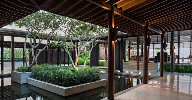 Set on the picturesque coast of western Bali, the resort is composed of generous, fluid spaces that allow for unobstructed views of the sea. The interior finishes are all inspired by local colours, crafts, and materials. Walls are clad in paras kelating, a cool grey sandstone manually extracted and transported from the banks of a nearby river; the intricate flower-patterned tiles are especially created for the spa feature wall by the artisans of Pejaten, a neighbouring village famous for its terracotta production. Batu candi, a local volcanic stone, brings the colour of the resort’s black sand beach within the interiors of the villas. The restaurant is furnished with one-of-a-kind suar wood tables and custom-made chairs with dark-stained, hand brushed timber frames contrasting beautifully with white linen of the seat. Bronze and stone accessories found throughout the development are also fruit of the collaboration between SCDA designers and local craftsmen. This collective design and construction process united the efforts of the SCDA team and the Balinese artisans, allowing the project to be thoroughly anchored in its surrounding context by literally moulding it out of locally available materials and skills, bringing a whole new twist on the concept of oeuvre d’art totale.